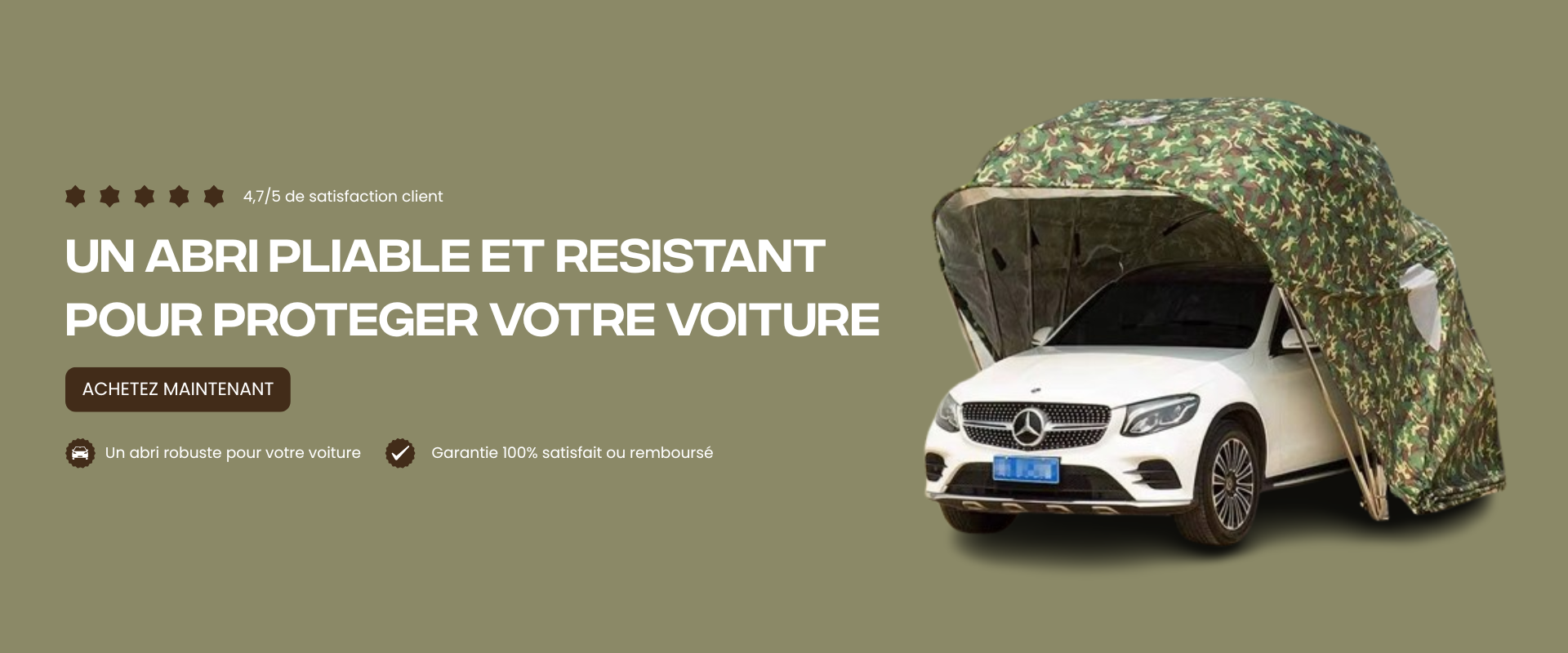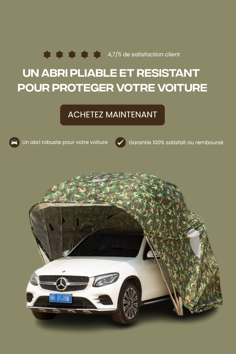 J’ai commandé un abri pliable pour ma voiture et je suis vraiment impressionné par la qualité. Le montage est rapide et le matériel est solide. Depuis que je l’utilise, ma voiture est parfaitement protégée du soleil et de la pluie. Je recommande à 100 % Stephano CruzFranchement, je ne m’attendais pas à une telle praticité. L’abri se plie et se déplie en quelques minutes, et il est assez léger pour être déplacé facilement. La livraison a été rapide et le service client super réactif. Je suis très satisfait de mon achat Joshua A.Excellente expérience d’achat ! Le produit correspond parfaitement à la description, robuste et esthétique. Ça m’évite les problèmes de poussière et de chaleur dans ma voiture. Très bon rapport qualité/prix. Je recommande cette boutique sans hésiter Raoul AlvarezSuper investissement ! Avant, ma voiture était pleine de poussière et de feuilles. Maintenant, elle reste nickel tous les jours. Montage en 5 minutes chrono ! Patrick D
